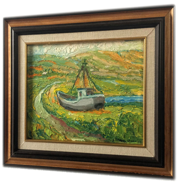 His style, his colors, his constructions sign for him. His paintings have already been found in several galleries (Baie Saint-Paul, Brossard, Île-aux-Coudres, Rimouski, Quebec, Chicoutimi, and Montreal). He also worked in bronze, and his limited edition sculptures depicting Quebec legends and customs became collector's items.