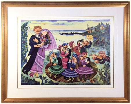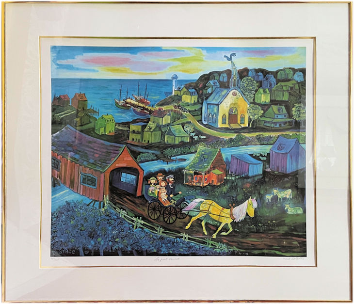 Born in 1920 in Shippagan, New Brunswick, Nérée De Grâce opened a graphic arts and advertising studio in 1949 after graduating in decorative and advertising arts from the École des beaux-arts de Québec (1948). From 1970, he devoted most of his free time to painting. In 1977, De Grâce became a full-time painter and created his own pictorial universe, in a very decorative style greatly influenced by certain works by Marc Chagall (Belarusian painter of Jewish origin, 1887-1985). Nérée De Grâce owes its popularity to Acadian singer Édith Butler, who contributed greatly to publicizing her artistic production from 1979 onwards. In addition, writer Antonine Maillet has selected a few canvases to illustrate her plays and novels. Canada Post has also chosen a work by Nérée De Grâce to illustrate the stamp commemorating the centenary of the first Acadian Convention, held in Memramcook in 1881. A book entitled: “Nérée De Grâce”, text by Pierre H. Savignac, preface by Guy Robert and photographs by Michel Julien, was published in 1987 by Éditions Marcel Broquet, LaPrairie, Quebec. Recipient of the Acadian Meritas Award from La Fédération acadienne du Québec inc. in March 1998. He received an Honorary Doctorate in visual arts from the University of Moncton (Shippagan University Center) during the graduation ceremony in May 1987. Nérée De Grâce died on January 12, 2002 at the age of 81 years old. He had lived in Quebec for several years.